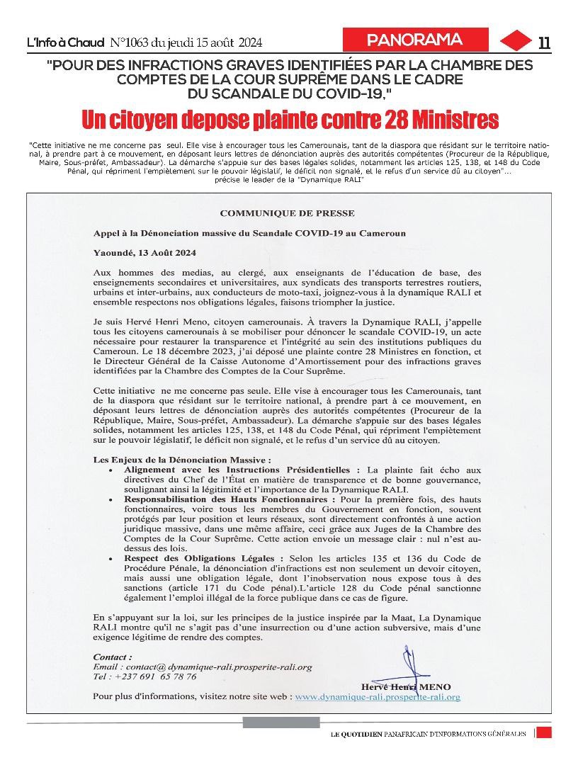 La Dynamique Citoyenne RALI (Renaissance de l’Âme des Lions Indomptables) est née d'un appel à la justice et à la transparence dans la gestion des fonds publics au Cameroun. Cette initiative a été lancée suite à la plainte déposée le 18 décembre 2023 par Hervé Henri MENO contre 29 hauts fonctionnaires camerounais, dont 28 ministres et le Directeur Général de la Caisse Autonome d’Amortissement, accusés de graves infractions révélées par le rapport de la Chambre des Comptes de la Cour Suprême.